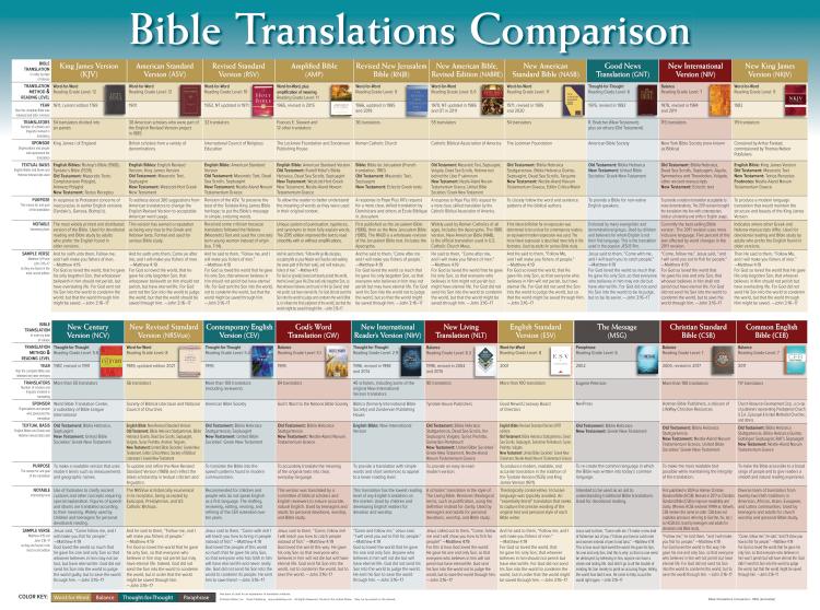 Bible Translations Comparison offers help in understanding translators’ different approaches (word-for-word, thought-for-thought, paraphrase, or some combination of the three). It also gives background on source texts and tells which texts were used for each version.