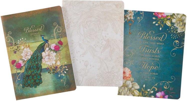 The notebook set features a captivating secret garden theme that showcases a brilliant blue peacock and a hidden antique key, and the sentiment focuses on the promise of blessing for those who choose to trust in the LORD.