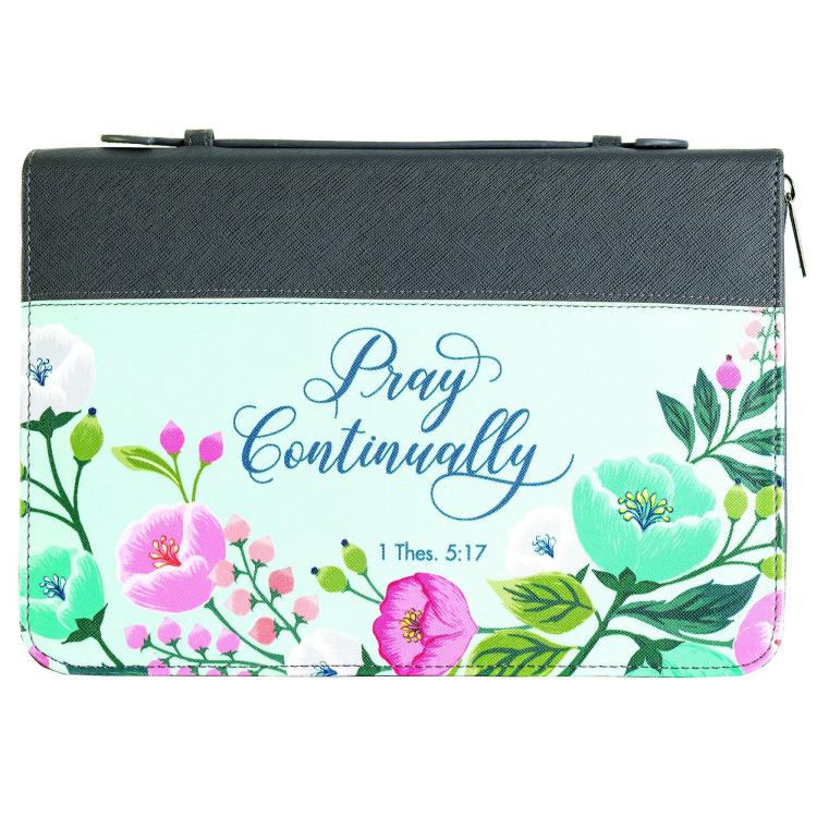 Bible cover with gray-colored body and floral accents. Features 1 Thessalonians 5:17: Pray Continually. Size XL.