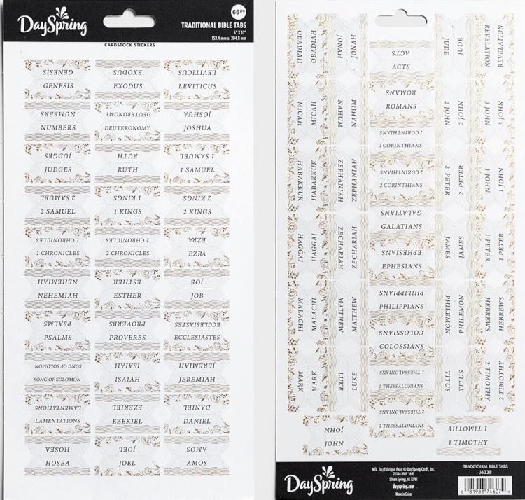 These beautiful tabs will help you navigate from Genesis to Revelation and everywhere in between! The simple peel-and-stick design are pre-scored for easy application into your Bible.